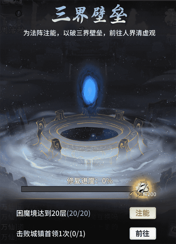 当你修为达到返虚/破虚中期后,,,可在城镇寻得芸丫并激活神秘法阵,,通过收集材料、、、、击败首领等方式为法阵注能,,,,借以打破三界壁垒,,开启支线剧情“清虚旧梦”